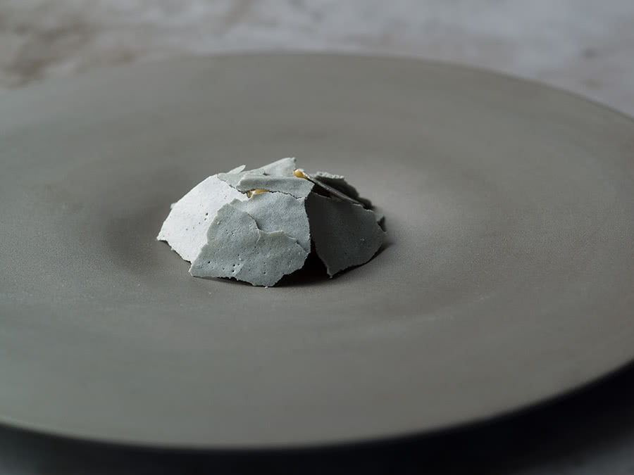 最初から決めていたわけではないのですが、店のインテリアのキーカラーは料理に集中してもらえるような無彩色にしようと思っていました。もともとグレーが好きだったので、店内は温かみのあるグレーをベースにしようと設計士さんと意見が一致。そのときに店内の工事と同時並行して、スペシャリテ用のオリジナルの器を作る相談を有田焼のカマチ陶鋪さんとしていたんですね。「スペシャリテはどんな料理なんですか」と聞かれたときにはまだなんにも決めてなかったんです。でも、食材を無駄にせずに全部使いたくて、青魚のフィレの部分を使った後に残る頭や骨を利用した料理ができたらなと漠然と思ってはいました。魚のアラの部分をミキサーにかけてメレンゲと合わせて焼いたらグレーになるということは知ってましたから、それを利用して、店内のグレーのトーンと同期させられるようなスペシャリテができるかも、と思いついた。誰もやってないし面白い、と思ったんです。
