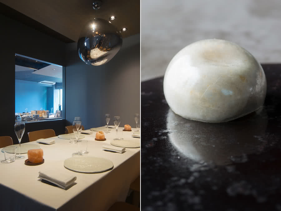 このデザートも、フォルムは個室のトム・ディクソンの照明と同じ形に作ったんです。これも「空間と料理を同期させたい」と思って生まれたもの。目にするもの、口にするものが一緒になることでレストランでの体験を印象的にできるかなと考えました。