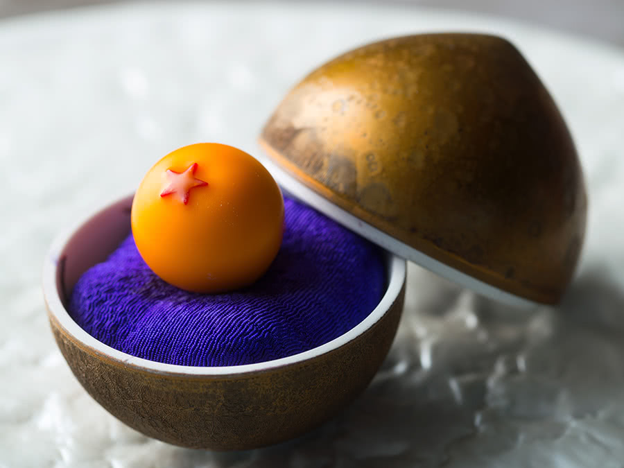 ボール』も、オマールのビスクをカカオバターで作って球状にできないか試作していたら、キレイなオレンジ色のものが出来て。「これ、ドラゴンボールみたいじゃない?」と厨房で盛り上がって、「じゃあ星描いてみる?」、「クッション置いてみる?」って遊びながら誕生したんです。店で出したら30代から40代の男性の受けがめちゃくちゃいいですね。