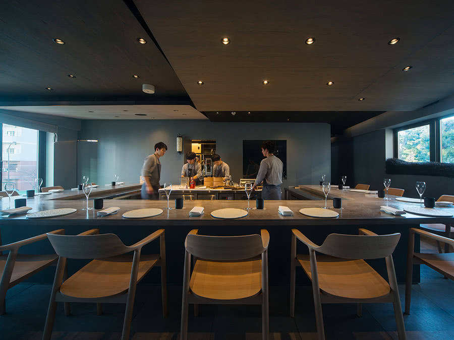 もともと、“いろんな食材が皿の上にたくさんあっても一つのものになっている”というのがやりたい料理の方向性です。空間も同じ。モルタル、木、ステンレスと素材感の違うものを使った集合体だけれど俯瞰すればひとつの世界になっている。その延長上に、空間と料理も同じ世界感にある、というのは意識しています。僕はお客様に気分がいい空間で食事をしてほしい。だから自分が“気分がいい”と感じる色を使い、好きな木のぬくもりある家具を配置し、好きな音楽をかけて心地良さをつくる。ゲストが空間にいるその“心地よい感覚”と料理が同期して、一つの世界観になることをイメージしています。