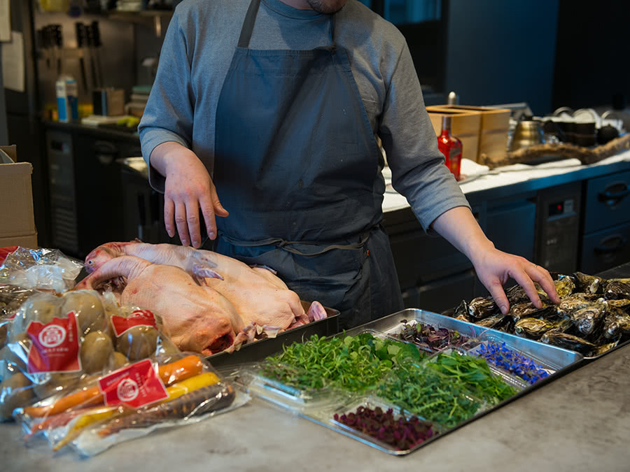 この日届いた食材の一部。「国東オイスター」、「梶谷農園のハーブ」、「京都・伊弥栄の鴨」、「能登・高農園の野菜」など。「この鴨は肥育している鴨なのにみずみずしくてジューシー。日本人が好きな味ですね。この牡蠣はクリーミーというよりクリアな味わい」と、食材について話しだしたら止まらない生井シェフ