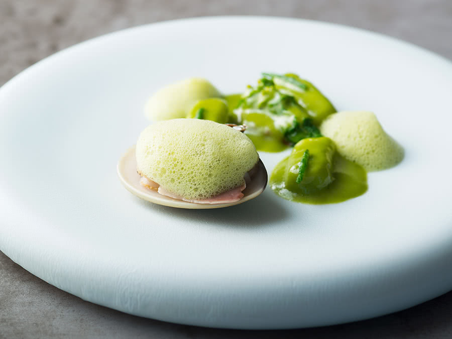 だしでさっと火を通したはまぐりの上にはゴーヤの泡。菜の花の苦みを生かしたニョッキははまぐりのだしやバターをあわせた菜の花のピュレが。ホタルイカのペーストが隠し味。これぞ”日本の春”を感じるフランス料理だ
